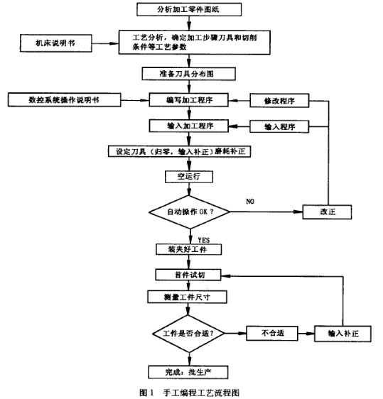 數(shù)控編程一般包括工件圖紙分析、工藝分析與設(shè)計(jì)、圖形數(shù)學(xué)處理、編寫(xiě)及輸入程序清單和程序檢驗(yàn)的全部工作,數(shù)控編程方法分為手工編程和自動(dòng)編程兩種,本文只討論手工編程方法。(導(dǎo)讀:數(shù)控車床CNC車削加工的編程要點(diǎn) http://www.m.930my.com/Article/shukongchechuangCNCc_1.html)手工編程的過(guò)程包括:工件圖紙分析、工藝性處理、數(shù)據(jù)計(jì)算、編寫(xiě)程序清單、程序的輸入及檢驗(yàn)等步驟,圖1是手工編程的工藝流程圖。