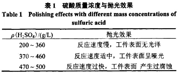 硫酸是強酸,又是強氧化劑,在化學拋光溶液中主要是溶解固態膜和形成固態膜,同時,在硫酸型拋光溶液中,它對不銹鋼表面有增光作用。其質量濃度增高,溶解和反應速度增大,工件尺寸消耗量增大,公差尺寸無法保證;質量濃度降低,形成和溶解固態膜的速度降低,在其它條件不變時,溶液對工件只起腐蝕而無增光作用。硫酸質量濃度與拋光效果見表1.