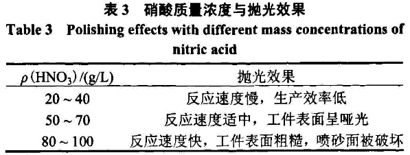 硝酸是強酸,又是強氧化劑,在化學拋光溶液中起溶解和鈍化不銹鋼的作用。在硫酸型拋光溶液中,其質量濃度越高,反應速度愈快,工件尺寸消耗愈大,易形成粗糙表面;質量濃度低,反應速度慢,生產效率低。硝酸質量濃度與拋光效果見表3。