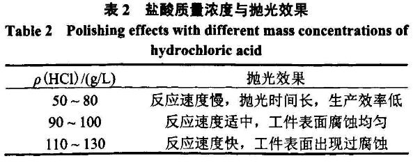 由表2可看出,鹽酸質量濃度為90~100g/L時,反應速度適中,工件表面拋光均勻。