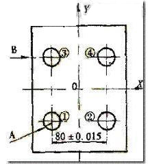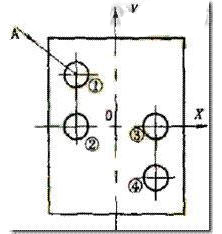 2)如圖6所示,工件的①、②、③、④孔的孔距要求精確,設(shè)編程坐標(biāo)系原點在工件中心點,對刀點(程序起點)也為同一點。如刀具移動路線為:原點O→①→②→③→④孔,則會產(chǎn)生反向間隙,如改為:原點O→A→①→②→③→④,即X方向和Y方向的尺寸保持連續(xù)遞減或遞增趨勢,如保持連續(xù)遞增和遞減編程有困難.則應(yīng)加過渡點,如圖7中的B點,刀具移動為A→①→②→③→④,就可消除機(jī)床反向間隙。