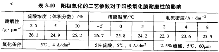 陽極氧化膜的耐磨性與工藝參數(shù)有關(guān),硫酸濃度愈高,陽極氧化槽液溫度愈高,則膜層的耐磨性愈低。在硫酸濃度和溫度一定時(shí),電流密度(固定膜厚不變)愈大則耐磨性愈高。表3-10是上述工藝參數(shù)對(duì)于陽極氧化膜耐磨性的影響,耐磨性用噴磨法測(cè)試,以磨去1μm陽極氧化膜所使用的砂的質(zhì)量表示,顯而易見使用砂的質(zhì)量愈大則耐磨性愈好。