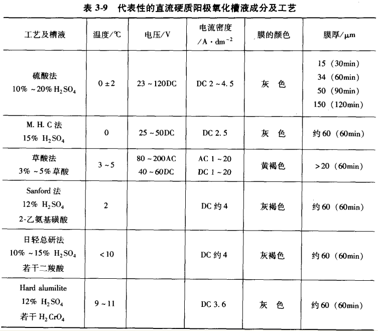 鋁合金硬質(zhì)陽極氧化處理主要用于工程或軍事目的,它既適用于變形鋁合金,更多可能用于壓鑄鋁合金零部件。(導(dǎo)讀:硬質(zhì)陽極氧化和普通陽極氧化的區(qū)別點(diǎn) http://www.m.930my.com/Article/yingzhiyangjiyanghua_1.html)硬質(zhì)陽極氧化膜一般要求厚度為25~150μm,大部分硬質(zhì)陽極氧化膜的厚度為50~80μm。膜厚小于25μm的硬質(zhì)陽極氧化膜,用于齒鍵和螺線等使用場(chǎng)合的零部件,耐磨或絕緣用的陽極氧化膜厚度約為50μm,在某些特殊工藝條件下,要求生產(chǎn)厚度為125μm以上的硬質(zhì)陽極氧化膜。但是必須注意陽極氧化膜越厚,其外層的顯微硬度可能越低,膜層表面的粗糙度增加。硬質(zhì)陽極氧化的槽液,一般是硫酸溶液以及硫酸添加有機(jī)酸,如草酸、氨基磺酸等。另外,可通過降低陽極氧化溫度或降低硫酸濃度來實(shí)現(xiàn)硬質(zhì)陽極氧化處理。對(duì)于銅含量大于5%或硅含量大于8%的變形鋁合金,或者高硅的壓鑄鋁合金,也許還應(yīng)該考慮增加一些陽極氧化的特殊措施。例如,對(duì)于2xxx系鋁合金,為了避免鋁合金在陽極氧化過程中被燒損,可采用385g/L的硫酸加上15g/L草酸作為電解楷液,電流密度也應(yīng)該提高到2.5A/dm^2以上。表3-9列出了一般常用的直流硬質(zhì)陽極氧化的槽液成分及工藝。