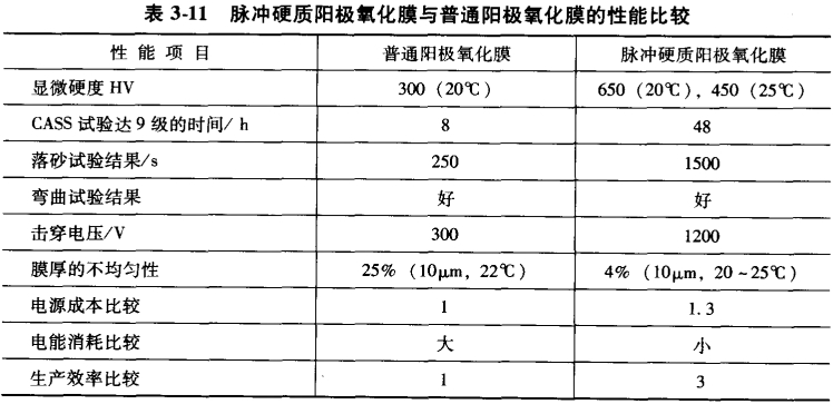 另外一個(gè)提高陽極氧化膜耐磨性的有效方法是采用脈沖電源,尤其在壓鑄鋁合金的厚膜制備方面更加有效。最常用的脈沖電源的波形是單向方波脈沖或交直流疊加。單向方波脈沖使用比較普遍,主要用于生產(chǎn)陽極氧化厚膜或硬質(zhì)陽極氧化膜。脈沖陽極氧化只有在高電流密度時(shí)才有明顯效果,從意大利EL-CA公司引進(jìn)的脈沖電源,由于建筑鋁型材陽極氧化的電流密度只有1.2~1.5A/dm^2,所以脈沖陽極氧化的優(yōu)勢(shì)沒有得到充分發(fā)揮。根據(jù)日本報(bào)道的數(shù)據(jù),表3-11列出了普通陽極氧化膜與脈沖硬質(zhì)陽極氧化膜的性能比較。從中可以看出,脈沖陽極氧化的生產(chǎn)效率較高,電能消耗較低。與此同時(shí),脈沖硬質(zhì)陽極氧化膜的硬度、耐磨性、耐腐蝕性、擊穿電壓和膜厚的均勻性都有明顯的提高,充分顯示出用脈沖技術(shù)生產(chǎn)硬質(zhì)陽極氧化膜的優(yōu)越性,但是,必須指出脈沖技術(shù)的優(yōu)勢(shì)只有在一定工藝條件下才可能體現(xiàn)。