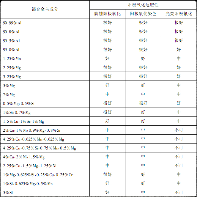 表1-1各種鋁及變形鋁合金的陽極氧化適應性