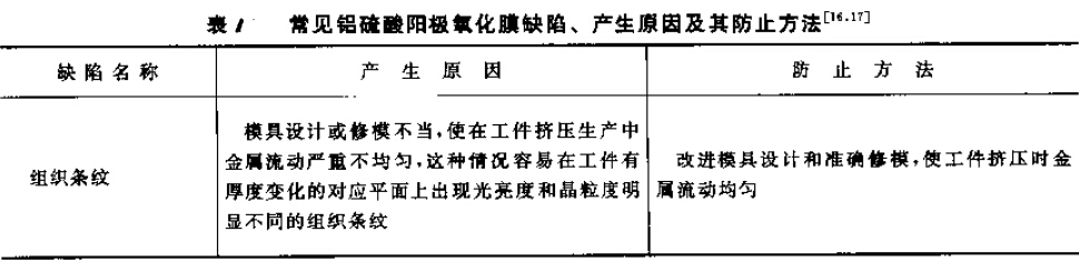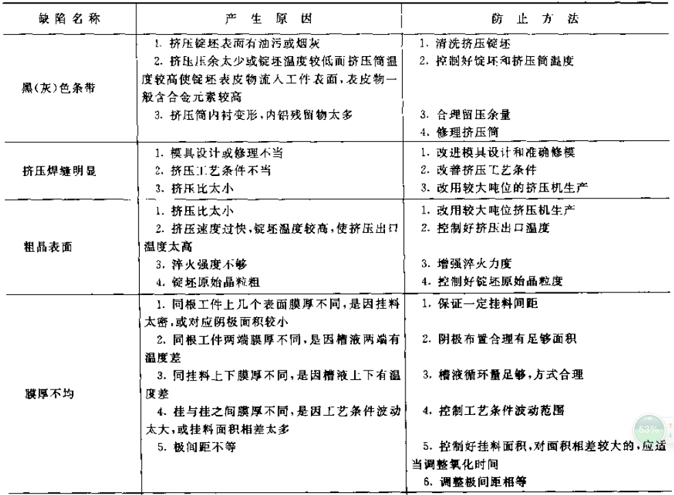 常見鋁硫酸陽極氧化膜的缺陷、產生原因及其防止方法見表